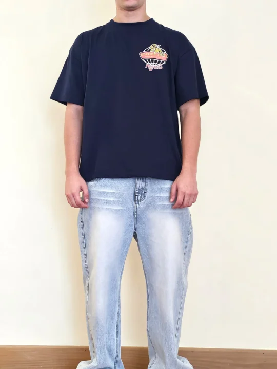 El diseño destaca por sus estampaciones combinadas en el delantero y espalda, aplicadas con técnica discharge, logrando un acabado de alta calidad y larga duración.